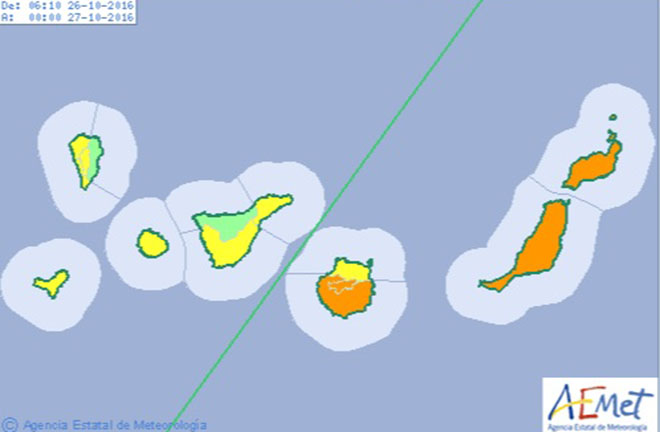La Agencia Estatal de Meteorología ha puesto en aviso naranja para este miércoles a las islas de Fuerteventura, Lanzarote y Gran Canaria, ante el riesgo de que se produzcan en ellas fuertes lluvias que descargarán hasta 80 litros por metro cuadrado en el curso de doce horas.